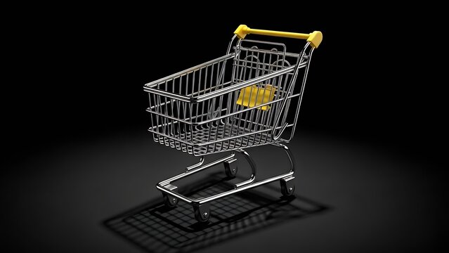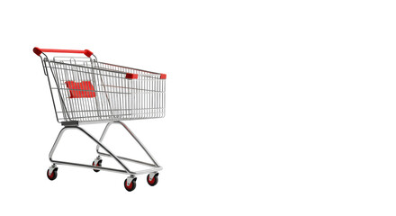A clean, empty metallic silver shopping cart with black wheels and red accents, studio shot on a transparent background, ample copy space, concept for e-commerce and digital opportunity