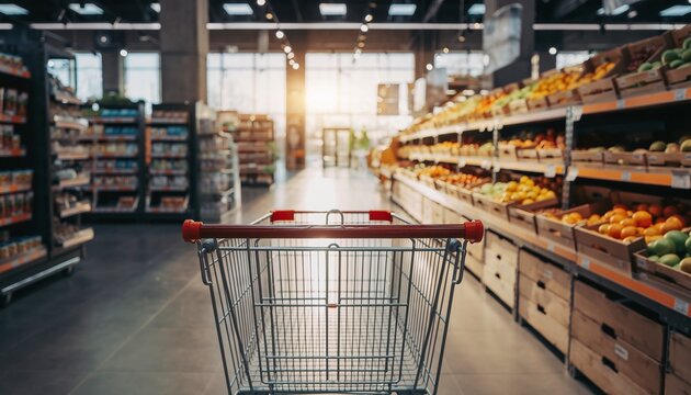 An empty shopping cart is in a bright supermarket aisle filled with fresh fruits and vegetables, concept for grocery shopping, retail, and healthy eating.