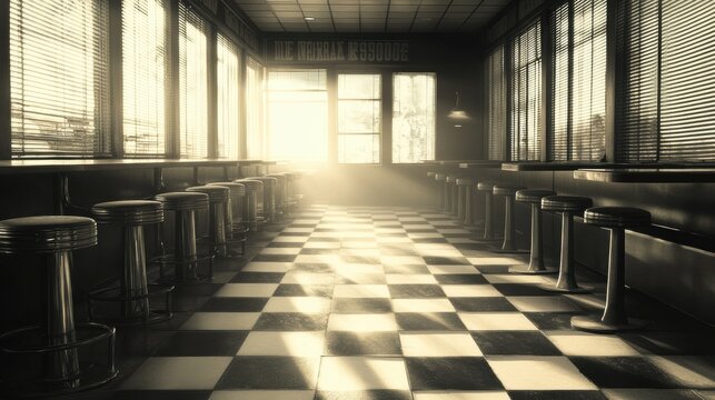 Sunlight streams into an empty retro diner with checkered floors and bar stools, AI