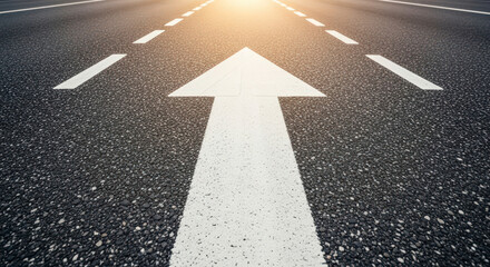 Wide, empty road with a large white painted arrow pointing straight forward, symbolizing progress, future direction, and the path to success with a bright light on the horizon