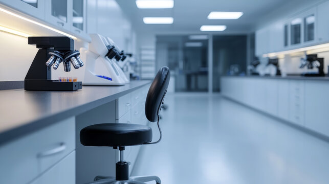 Modern laboratory with clean white counters, blurred background, and microscope in focus. Clinical and research setting