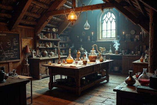 Female science instructor teaching stem students in modern lab classroom with chemistry board