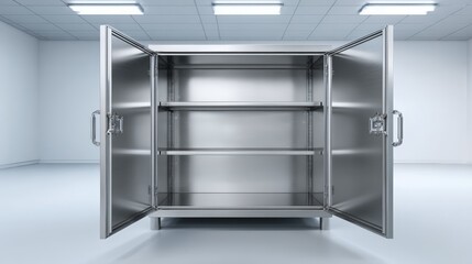 Open Stainless Steel Cabinet with Shelves in Clean Room: Industrial Storage Solution