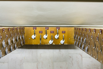 Seats for a team of football players with a blue uniform on top in the locker room in the locker room at the Giuseppe Meazza or San Siro stadium, built in 1925. Milan of Italy.