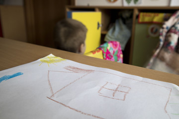 children's drawing on a background of multicolored wardrobes dressing up in kindergarten, elementary school