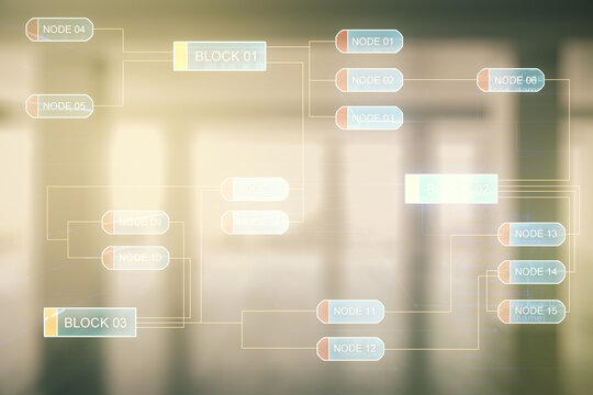 Double exposure of abstract creative programming illustration on empty room interior background, big data and blockchain concept