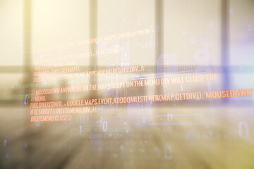 Abstract virtual coding illustration on modern interior background, software development concept. Multiexposure