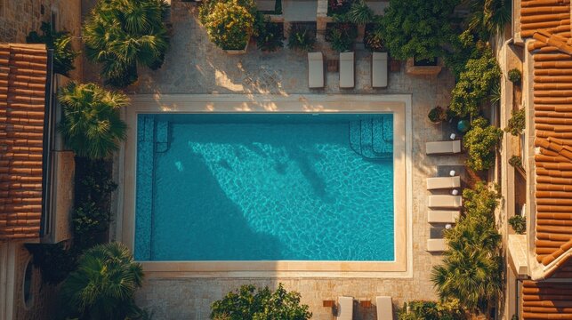 Luxurious aerial view of a serene empty swimming pool oasis with lush greenery and lounge chairs under soft sunlight