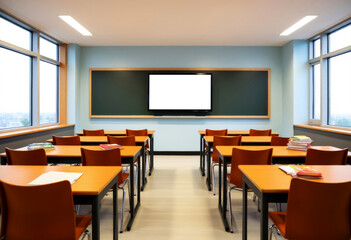 classroom interior with rows of chairs and empty board, college auditorium interior