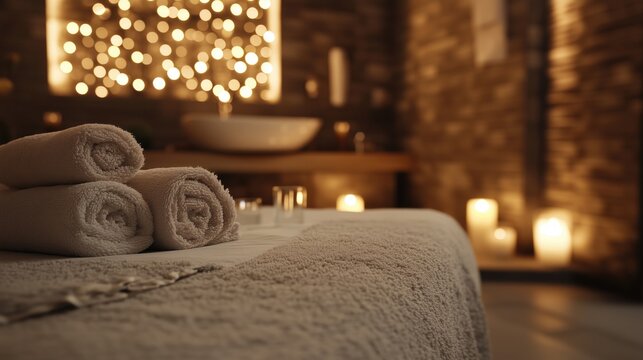 Cozy empty spa room premises with dim soft light and candle decoration with no people and inviting bed in japanese style with rolled towels and green plants