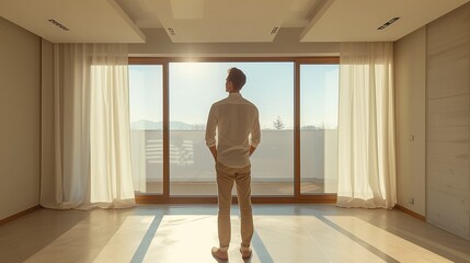 Young female property buyer is thinking of buying a modern skyscraper premises for future office space. Woman entrepreneur is standing with crossed arms in empty interior with copy space for advertise