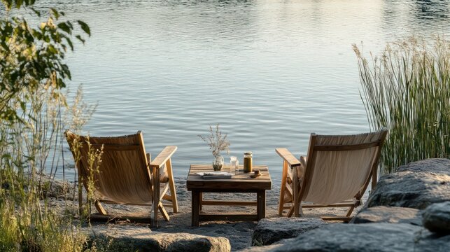 A lakeside setup with rough-hewn chairs, a simple wooden table, and a backdrop of calm water