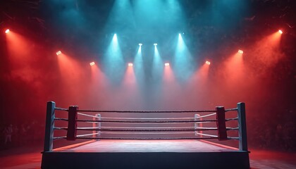 Empty boxing ring under dramatic red and blue spotlights in a smoky arena. The fight night atmosphere creates intense anticipation for combat sports, championship matches, and athletic competition.