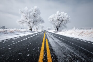 Snowy winter road stretches into the distance surrounded by frosted trees under a cloudy sky