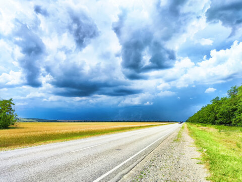 Empty country road stretching into distance under cloudy sky, rural landscape and fields, calm travel mood, journey and movement concept in overcast weather