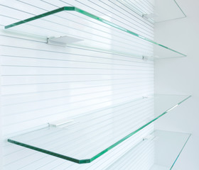 Universal minimalistic background for product presentation. White empty shelf on a light gray wall.
