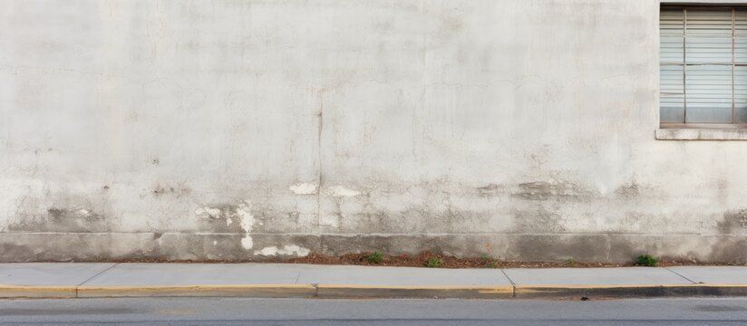 Weathered white wall surrounds a building with a sidewalk and road in front, creating a backdrop for a copy space image.
