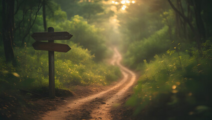 An empty trail winding through dense forest with a wooden signpost pointing forward