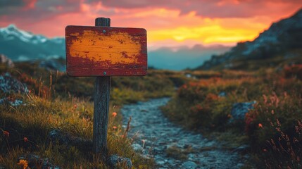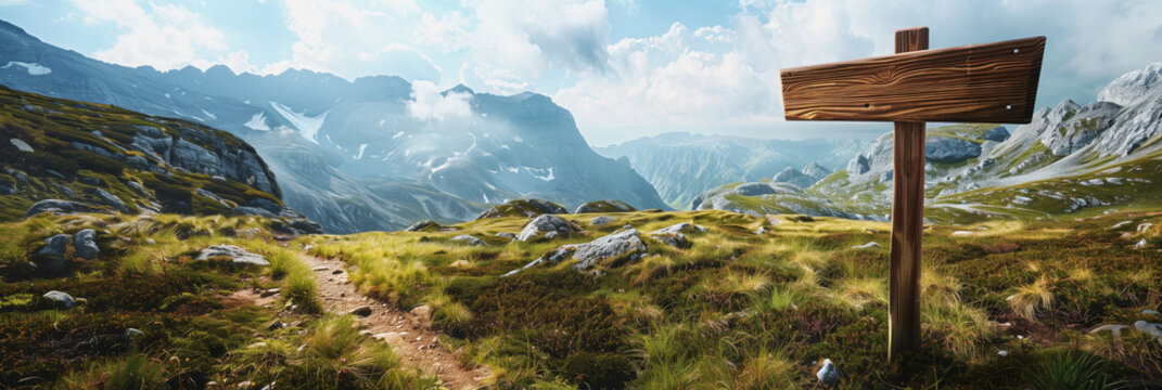 Stunning panoramic mountain landscape featuring an empty wooden signpost and a winding trail.