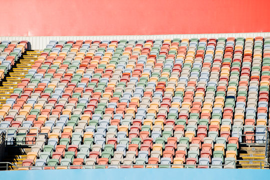 Empty multi-colored seats at a sporting venue.