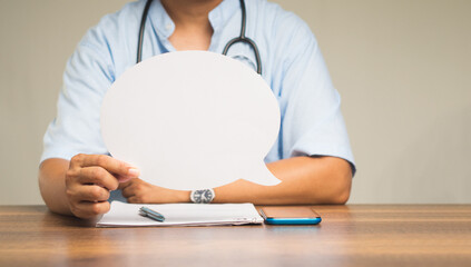 Doctor holding a blank speech bubble while sitting at the table in the hospital.