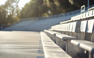 Serenity at the Stadium, Empty Bleachers Awaiting the Roar of the Crowd, bathed in Soft Sunlight on a Peaceful Afternoon