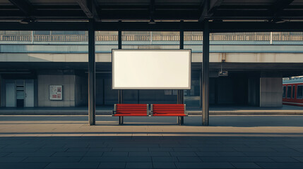 Empty advertising billboard mockup on a railway station platform with two red benches, early morning