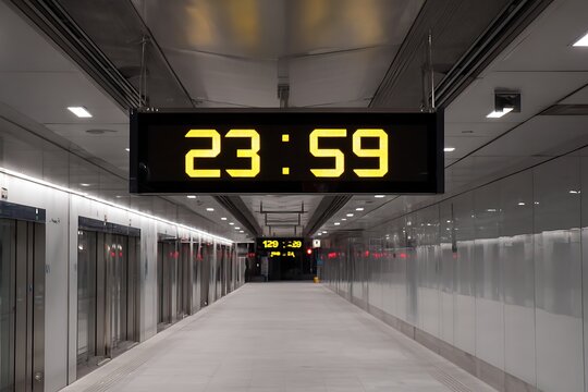 A modern, empty subway platform at 23:59, featuring a prominent digital clock and sleek, illuminated architecture.