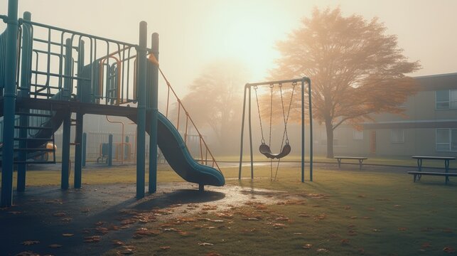 An empty school playground with swings, a seesaw, and a slide in the early morning. Generative AI