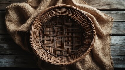 Top-down shot of an empty wicker basket on a wooden countertop