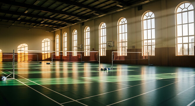 Interior view of a spacious gymnasium with badminton nets and natural light streaming through arched windows.