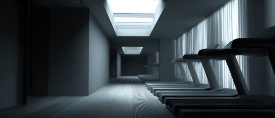 Rows of treadmills line a modern fitness center illuminated by natural light streaming through the skylight and sheer white curtains.