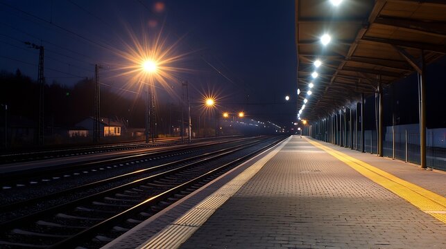 Quiet train station at night illuminated by warm lights casting reflections on the empty platform : Generative AI