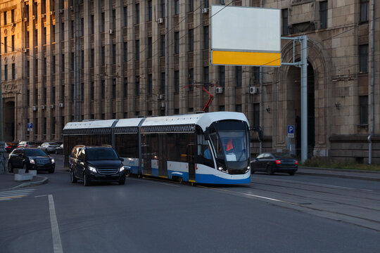 City evening landscape. Modern city tram, empty billboard, mock-up.