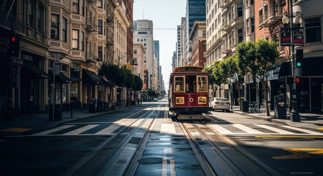 Interior of a modern tram with yellow poles and patterned seats. Digital screens display route information. The empty seats and clean design emphasize urban public transportation efficiency.