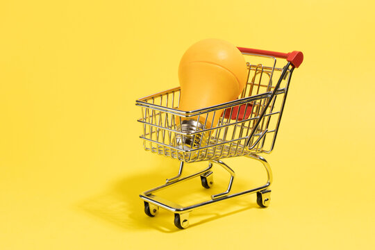 Shoping cart with light bulb on yellow background. Copy, empty space for text energy price concept