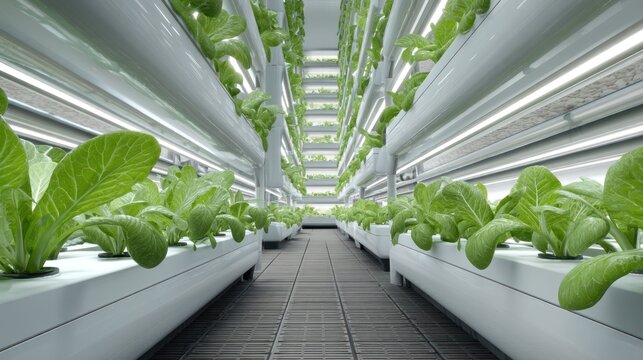 A modern, indoor hydroponic farm with rows of lettuce plants under artificial lighting.