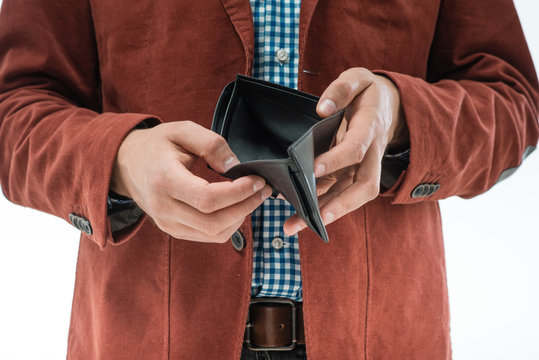 Portrait of an elderly woman holding an empty wallet and shocked isolated on transparent background