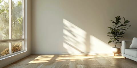 white empty room with shadow window and green plant on white wall luxury background and wooden floor