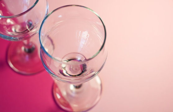 Glass transparent wine glasses on leg on pink background. Highlights and shadows on the dishes.