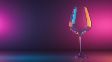 Single elegant wine glass on a colorful background in shades of purple, highlighting its design and clarity. Vibrant banner with empty space
