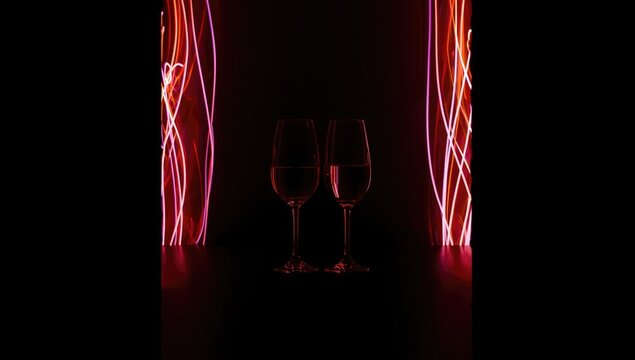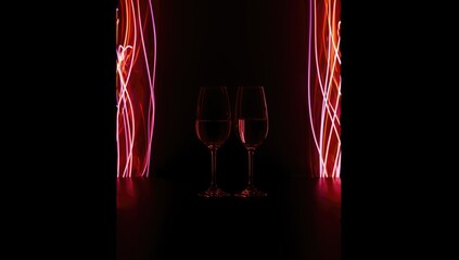 Pair of wine glasses illuminated by colorful neon streaks on a black background, highlighting light drawing techniques, suitable for a nightlife setting