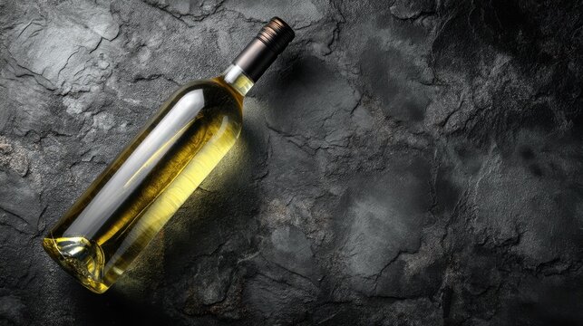 A bottle of white wine is positioned on a dark stone surface. The background is uneven highlighting the shape and label of the bottle in a bright light.
