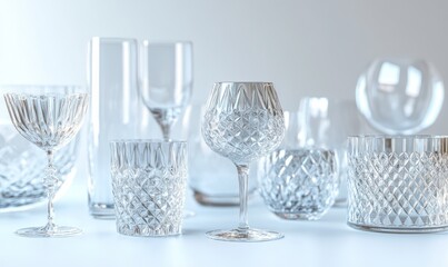 Set of elegant crystal glassware arranged on a white background, sharp reflections and bright highlights, minimalist and luxurious presentation, clean and modern style,