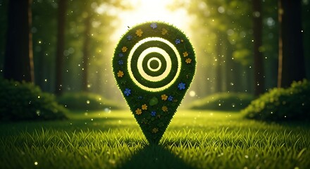 Glowing location pin with target symbol stands tall in a sunlit enchanted forest clearing