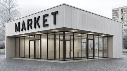 Modern market building with large windows and clear signage in an urban setting during a winter day