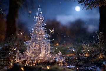 christmas tree made of glowing crystal shards in enchanted forest clearing fairies flying with lanterns silver moonlight illuminating concept of festive holiday photography unusual magical location an