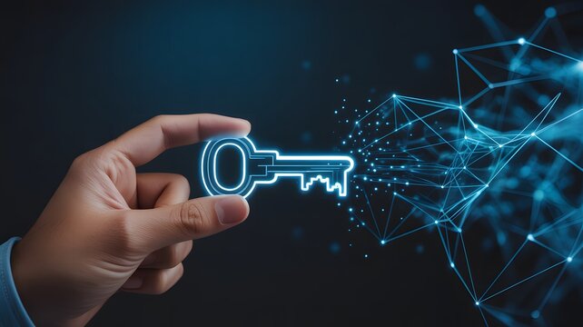 A person s hand holds a glowing digital key representing access to a complex technological network solution