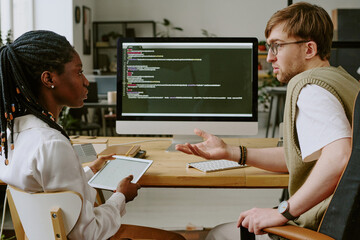 Wide shot of biracial highly qualified programmers having lively discussion in office, they sitting in modern office with digital devices