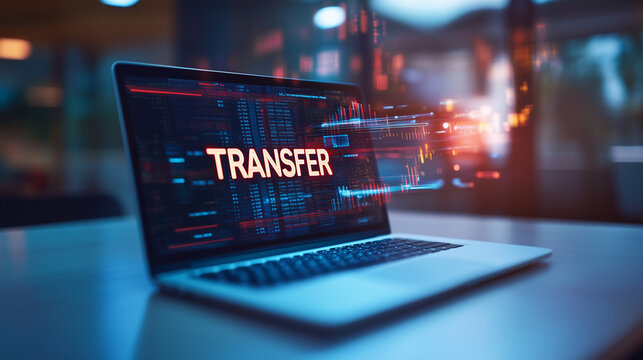 word "TRANSFER" display on laptop screen with a digital transaction background on the table in modern office, concept of digital data transfer